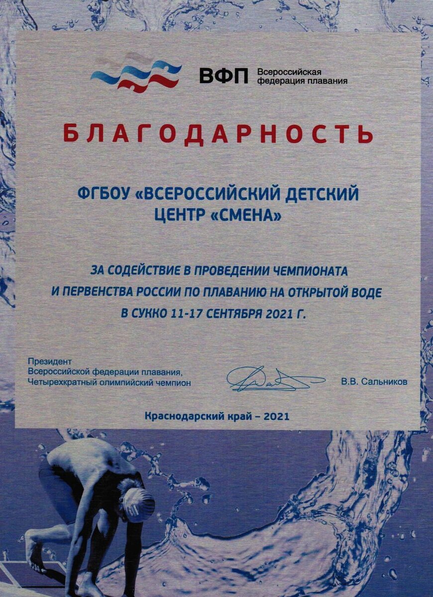 13 сентября в рамках специальной церемонии награждения президент Всероссийской федерации плавания, член бюро Международной федерации плавания водных видов спорта, четырехкратный олимпийский чемпион Владимир Сальников поблагодарил руководство и сотрудников ВДЦ «Смена» за содействие в проведении чемпионата и первенства России по плаванию на открытой воде и вручил благодарность. Соревнования начались 11 сентября и завершатся 17 сентября 2021 года. Отметим, что данные состязания являются первым этапом отбора для участия в международных соревнованиях по плаванию на открытой воде 2022 года: