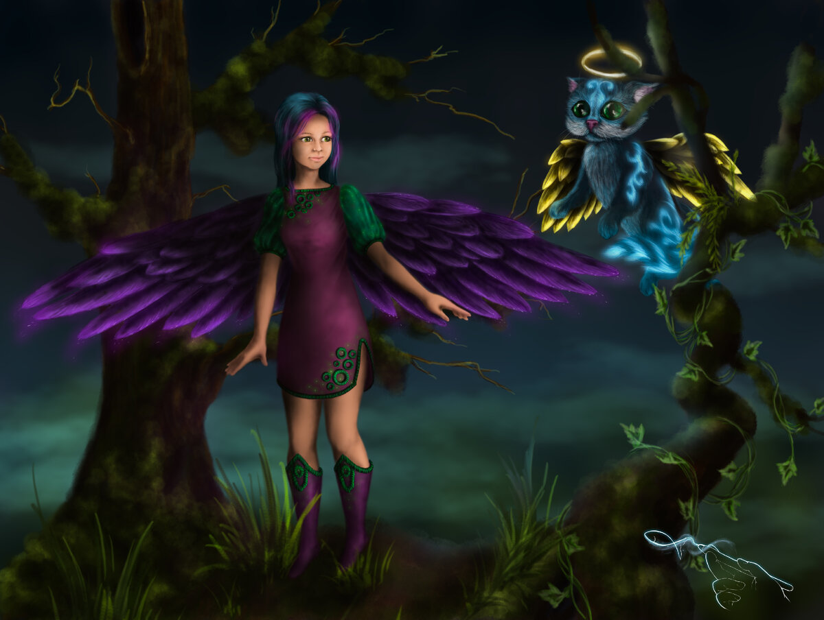 Всем здравствуйте. Добро пожаловать на канал "Море идей". Часто читаю в интернете, что с рождением детей не хватает времени на творчество. У меня всё иначе. Моя дочь помогает мне творить. Она дала мне задание, нарисовать персонажей, которых она слепила из пластилина. Начинаю с наброска.. Добавляю цвет. Рисую лицо девушки, назову её феей. Прорисовываю детали тела. Завершаю образ феи. Теперь волшебный питомец. Приступаю к фону. Для начала делаю небольшой набросок. Дальний фон делаю размытым. Прорисовываю дерево. Добавляю детали. А теперь второе дерево, трава. Добавляю тени и свет. Немного убираю насыщенность, туман и подпись. На этом всё. Занимайтесь творчеством вместе со своими детьми. Возможно это выведет вас на совершенно другой уровень. Спасибо за внимание.