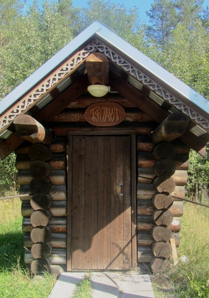 Выехали из Питера мы (три рыбака) 5 сентября в 6 часов утра в сторону шоссе Кола и по нему в Карелию. Ехали уверенно: водитель Антон уже бывал на Выгозере и дорогу знал. О том, что въехали в Карелию мы узнали на первой же карельской бензоколонке: в отличие от убогих российских общественных туалетов, здесь стоял рубленый туалет изумительного художественного вида с юморной надписью.