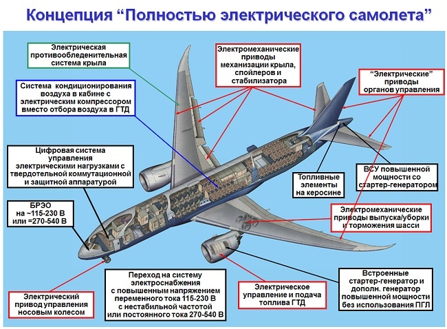 Облик "полностью электрического самолета" Предъявление высоких требований к самолетам следующего поколения, с точки зрения стоимости эксплуатации, экологичности и топливной эффективности, ставит перед авиационными специалистами целый ряд проблем, которые требуют поиска принципиально новых подходов к построению энергетической системы самолета. Как известно, в настоящее время на самолетах используются три вторичные энергетические системы: система электроснабжения, гидравлическая система, пневматическая система. Такое построение бортовой системы энергоснабжения для перспективных ЛА не является оптимальным, требует существенных затрат на его эксплуатацию и вызывает значительные трудности при интеграции бортового оборудования. Одним из наиболее перспективных направлений создания конкурентоспособного отечественного самолета является переход к концепции самолета с полностью электрифицированным оборудованием (условное устоявшееся наименование – "полностью электрический самолет" или ПЭС). Под