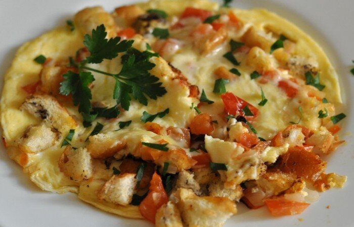 Ингредиенты: Приготовление: Шаг 1. Одну маленькую луковицу обжарить на масле, два маленьких помидора порезать и добавить к луку. Шаг 2. Два ломтика батона порезать кубиками и добавить к обжаренным луку и помидорам. Шаг 3. Два яйца взбить, присолить, вылить в сковороду. Шаг 4. Перемешать. Шаг 5. Посыпать тертым сыром, накрыть крышкой. Как только сыр расплавится - готово. Приятного аппетита!