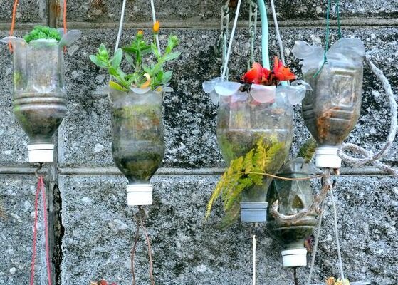 Дача у нас совсем маленькая, крохотная просто – трех соток не наберется. Ну экономим место, как можем. Средств особых нет для дорогих материалов. Но, как говорится, «голь на выдумки хитра». И подсмотрел где-то муж идею, как сделать вертикальную грядку. Сделал из все тех же пластиковых бутылок. Почему из все тех же? Да потому, что мы их не выкидываем. И воду в них наливаем осенью из родника и оставляем на даче на зиму. А весной – разлив, до родника не добраться, а у нас в запасе водичка есть! Только не надо наливать до горлышка воду, чтобы зимой от мороза не разорвало. Еще мы пластиковые бутылки как мини-парнички используем, накрываем от холода всходы огурцов, и даже тепличку из них муж соорудил. Отвлеклась я. Итак, Сеня взял за основу пластиковые бутылки. Он очистил бутылки от этикеток, разрезал их посередине. Нижняя часть предназначена для земли, а верхняя вставляется в основу горлышком вниз, куда и высаживается растение. Эти емкости он закрепил на деревянном стеллаже, который смаст