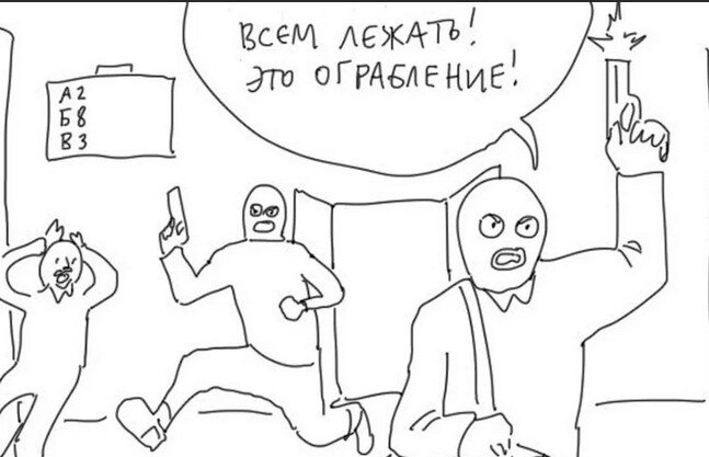 Оставив газеты на скамье, ребята направились к открытым дверям кафешки. Устроились за столиком у окна. Они уже доедали второе, когда в кафе вошли трое в натянутых на лицо вязаных шапочках. В руках двоих были пистолеты, у третьего – бейсбольная бита. Один остался стоять у входа, двое других ломанулись в зал обирать посетителей.