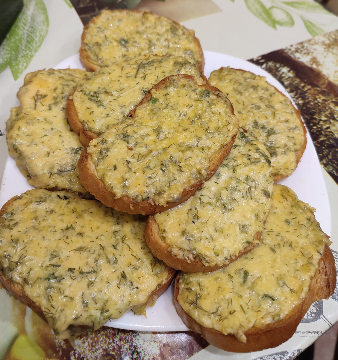 Когда друзья уже на пороге, а Вы не успели ничего приготовить, то на помощь приходит эта быстрая закуска, которую просто сметают со стола. И так нам потребуется: Сыр-250 граммов Чеснок-1 головка Укроп-пучок Майонез Батон нарезной (у меня было 9 кусочков) Приступим : Нарезаем батон и отправляем на противине в духовку (160-180 градусов) минут на 10 (пока батон не станет сухим) В это время делаем начинку. Сыр и чеснок трем на мелкой терке, добавляем мелко порезанной укроп и заправляем майонезом. Полученную смесь выкладываем на батон и отправляем на 10 минут в духовку. Закуска получается бесподобной!!!