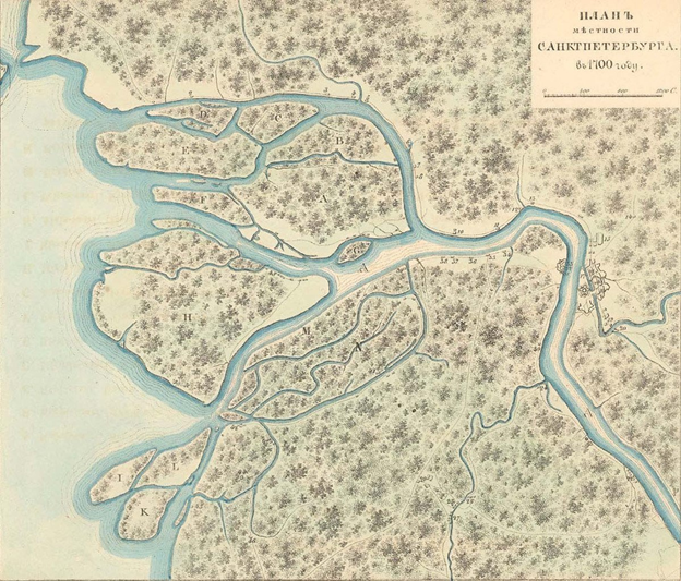 Так выглядел план местности, занимаемый городом, незадолго до закладки Петропавловской крепости. Первый план Санкт-Петербурга датируется 1705 г. Помимо крепости на нем уже отчетливо просматриваются Адмиралтейство и Новгородский тракт. В 1712 году Пётр I издал указ о создании Генерального плана Санкт-Петербурга. Было разработано несколько противоречащих друг другу планов.