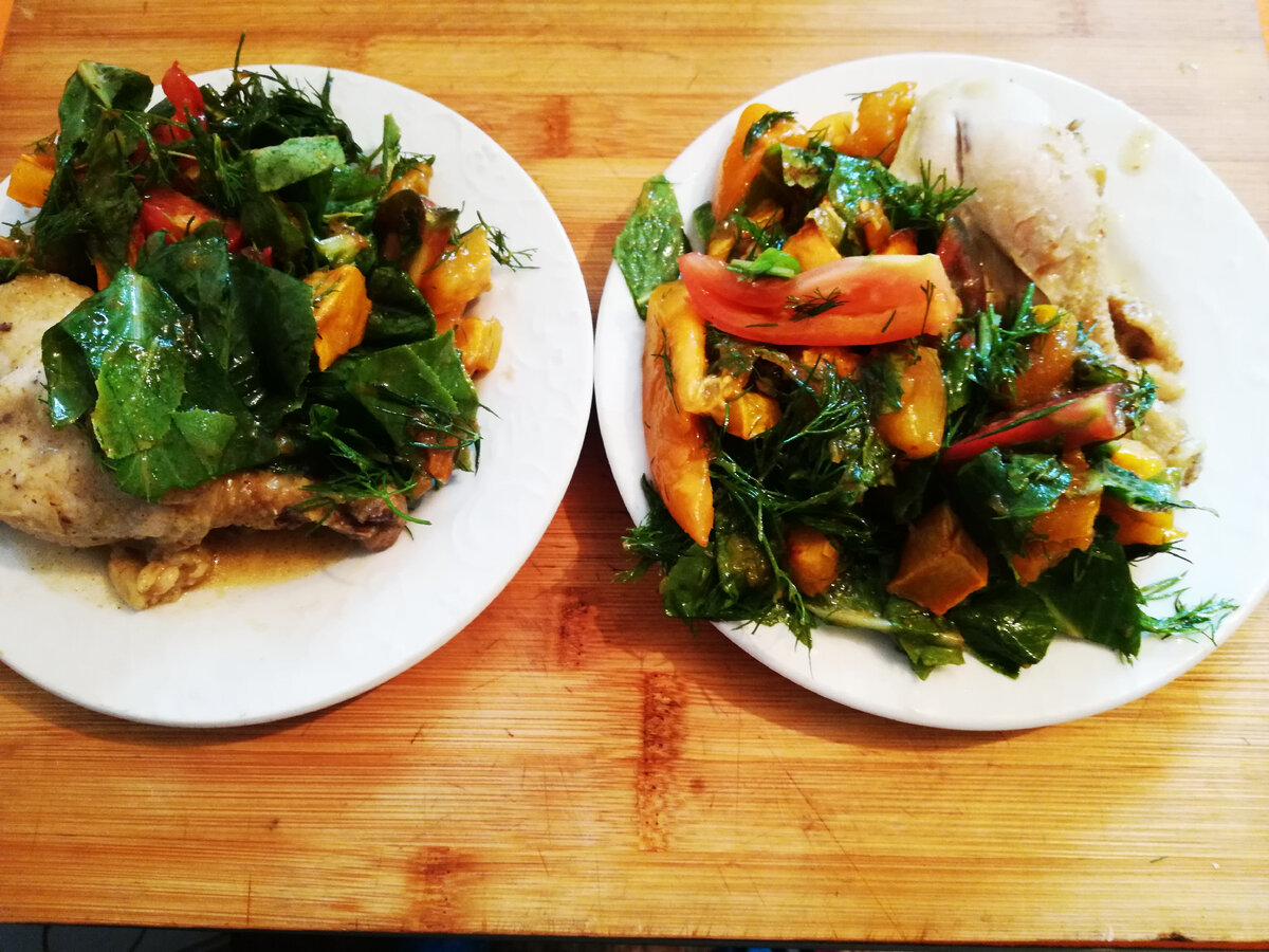 Что приготовить из тыквы? Сегодня делюсь простым рецептом салата. Такой салатик подойдет к хорошему мясному стейку, запеченной рыбке любой, конечно же к курице в любом виде отварном, печеном. И поверьте на слово, тыкву будет есть даже тот кто никогда не ел данный овощ. Салат готовиться очень просто. Сразу хочу сказать есть два способа приготовление тыквы: 1. Можно воспользоваться электрогрилем и 2. запекать в духовом шкафу. Первый способ сокращает время готовки тыквы примерно на минут тридцать, но есть вероятность, что кусочки могут немного потерять свою форму, но это не очень страшно. Ниже продукты рассчитаны на три порции. Итак для данного салатика мне потребовалось: Листья любого салата в идеале будет руккола и обычный листовой салат – большой пучок Тыква – 400 грамм Помидоры – 400 грамм Заправка: 2ст.л. – горчицы Растительное масло – 3ст.л. Соевый соус – 5 ст.л. Приготовление: Тыкву нарезаю на не большие порционные кусочки и отправляю запекаться в духовой шкаф на температуру двес