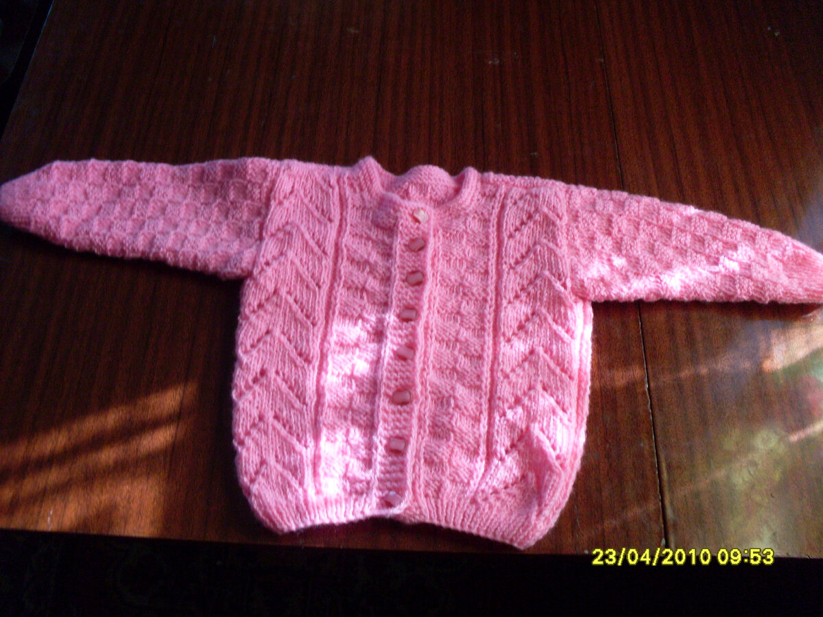 Детская розовая кофточка кофточка с застежкой на пуговицы , Потребуется по 200 г пряжи полушерсть,250 м /100 г) розового цвета, сп № 2,5 и 3,5 маленькие пуговицы РЕЗИНКА 1Х1: 1 лиц, 1 изн, ВЕРТИКАЛЬНЫЙ УЗОР по схеме ,УЗОР ШАХМАТКА 1 и 3 ряд- 4 лиц, 4 изнаночных, 2 р и все четные ряды как смотрят петли 5 и 7 ряды- 4 изн,4 лиц КОФТОЧКА: СПИНКА и ПОЛОЧКИ до линии пройм вяжутся одним полотном: Набрать на спицы 2,5 128 п и вязать резинкой( при этом в начале и в конце полотна вяжем по 5 п платочной вязкой для планок,выполняя одновременно петли для пуговиц) перейти на сп 3,5 , далее продолжить работу распределив петли так : кром, 5 п планки,1 лиц , 8 петел, узора Шахматка, 14 п вертикального узора 52 п узора шахматка, 14 п вертикального узора 8 п шахматки 1 лиц, 5 п планки, кром, на высоте 27 см от начала работы разделить работу на 3 части( 36 п полочка, 56 п спинка, 36 п полочка) ,закрыть для пройм по 5 п,вязать раздельно,на высоте 38 см от начала работ