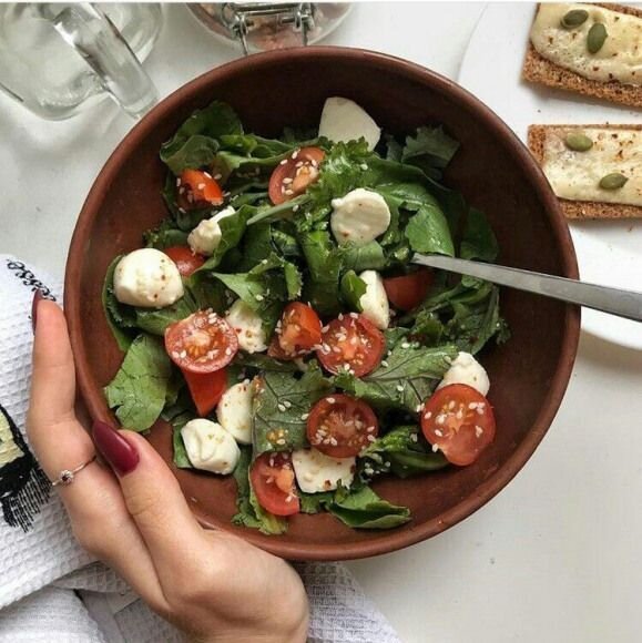 Полезный и вкусный сезонный Салат с помидорами Ингредиенты: Помидоры черри – 200гр Шпинат – 50гр Белый кунжут – щепотка Сыр моцарелла – 150 гр. Масло оливковой – 2 ст.ложки Приготовление: Все продукты обмыть, обсушить. Помидоры черри разрезать пополам. Шпинат крупно нарвать. Посыпать кунжутом, залить оливковым маслом. Перемешать. Салат готов