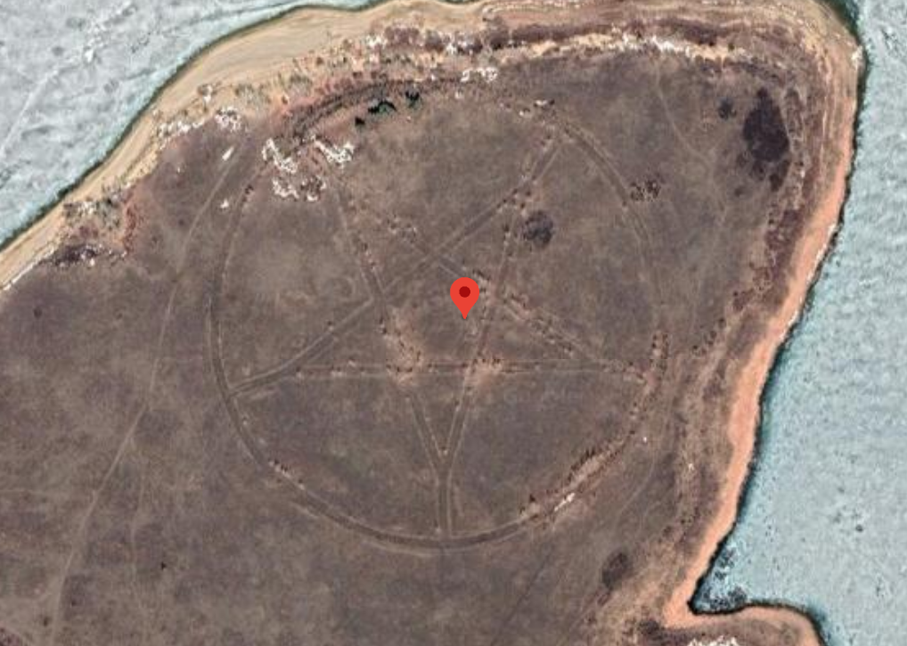 Пятиконечная звезда, найденная на Google-картах в 2009 году взбудоражила умы пользователей - все пытались гадать, зачем столь огромный символ диаметром в ~400 метров был начерчен в Казахстанской глуши, около Верхнетобольского водохранилища?