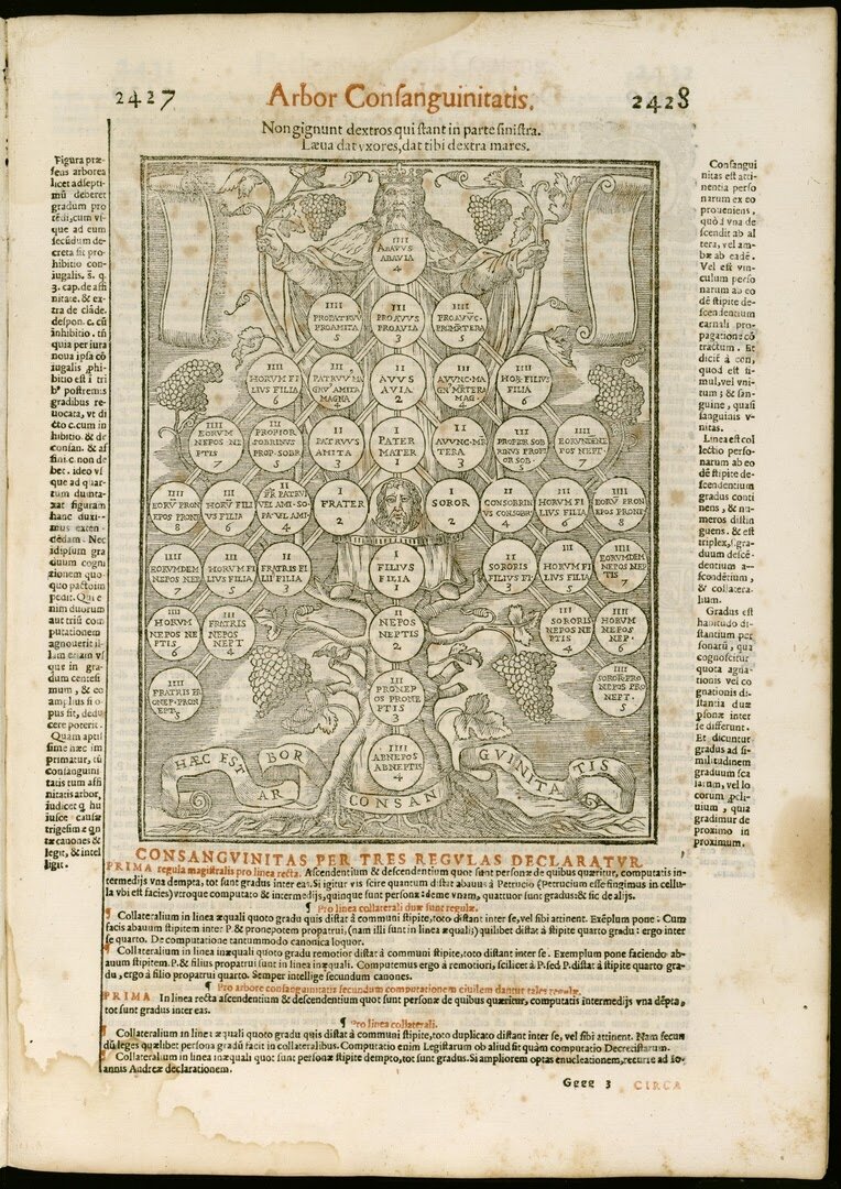 Но вернемся к sanguinitas, родству по крови. Древнейшие каноны налагали запрет на браки между родственниками до 7 степени (7 gradus) [3]. Но что же такое gradus и как его правильно посчитать? Великие отцы церкви, теологи и юристы исписали горы страниц, чтобы ответить на этот вопрос. Мы рассмотрим тот вариант, где gradus – это шажок (что, собственно, слово gradus и означает) от одного родственника к другому на генеологическом древе. Это древо, Arbor consanguinitatis, разместилось в нашей книге на col.2427-2428.