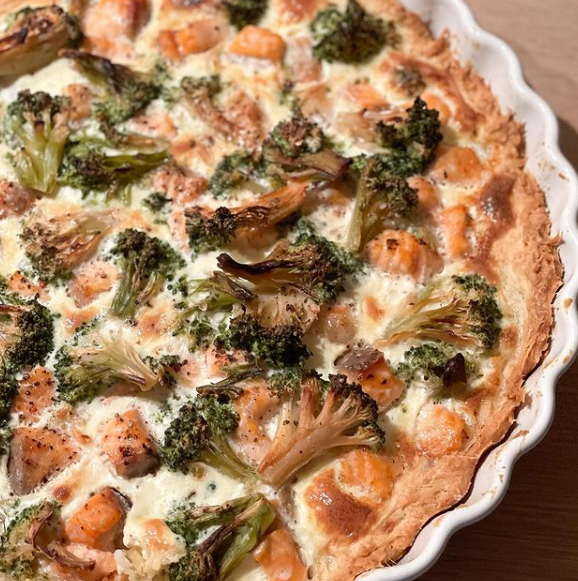 4. Тем временем подготовьте начинку. Нарежьте филе семги кубиком 1см, разберите брокколи на соцветия.