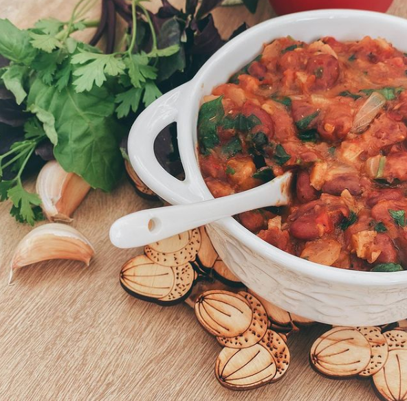 3. К помидорам и луку добавить банку фасоли (без рассола, он понадобится позже). Размять фасоль вилкой. Когда масса начнёт густеть, добавить столовую ложку рассола, оставшегося от фасоли.