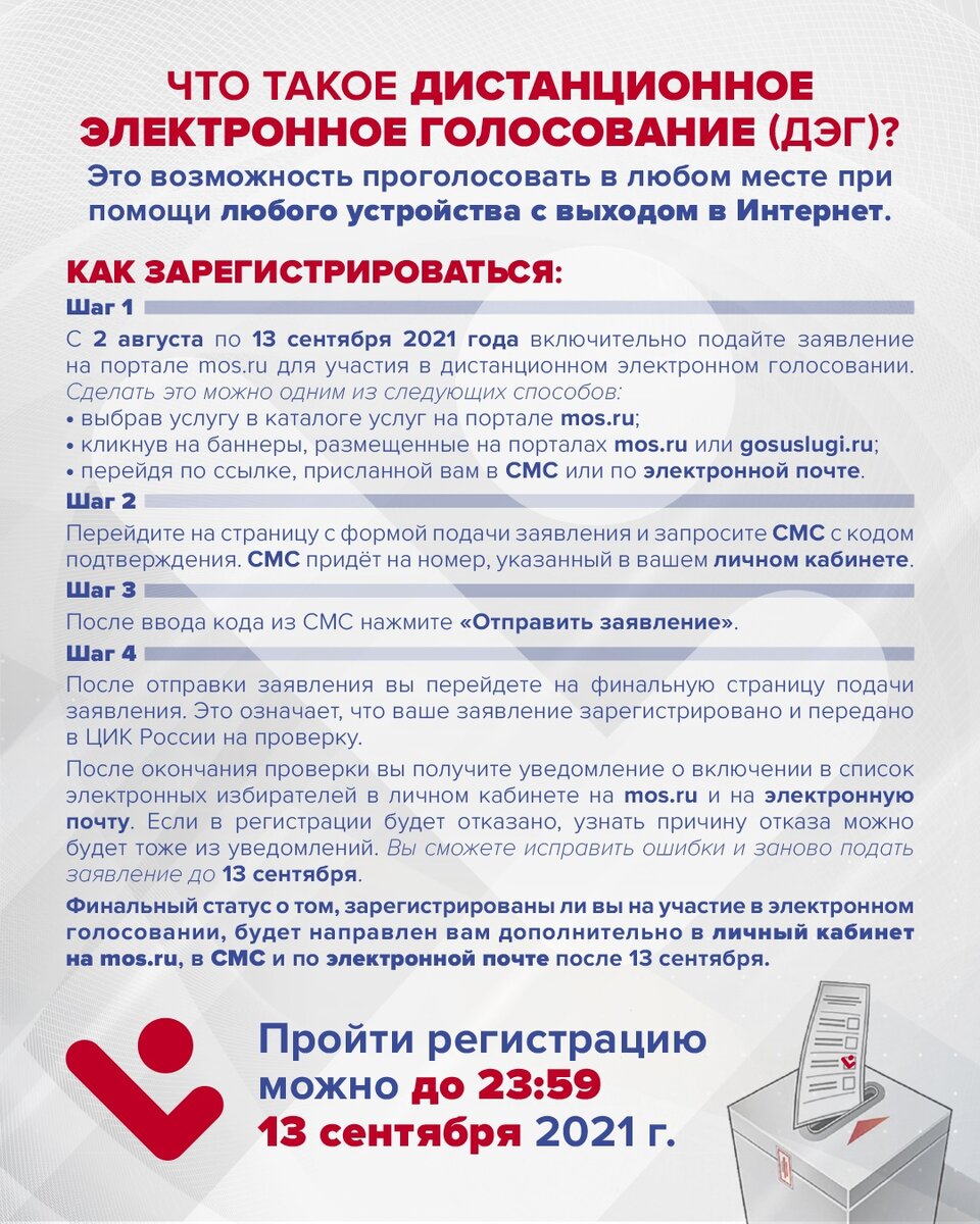 Регистрация для участия в дистанционном электронном голосовании закроется сегодня, 13 сентября в 23.59. Если вы еще не зарегистрировались - поспешите подать заявление! ДЭГ - это возможность принять участие в выборах в любом месте, при помощи любого устройства с выходом в Интернет! Голосование пройдет с 17 по 19 сентября 2021 года! Для голосования необходимо: Зайти на сайт https://vybory.gov.ru/ Авторизоваться через портал mos.ru Следовать инструкциям на экране Подробнее о процедуре регистрации в нашей инструкции.