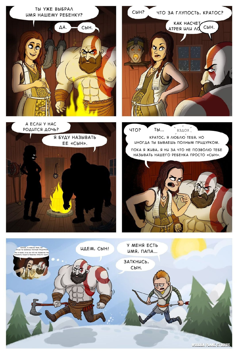 Одним из главных мемов, связанных с God of War 2018 года, стала манера главного героя - Кратоса - обращаться к своему сыну Атрею. Суровый белокожий воин почти никогда не называл своего отпрыска по имени и чаще всего ограничивался словом «boy» (англ. «мальчик»), что в русской озвучке перевели как «сын». Авторы проекта Wooden Plank Studios (Студия «Доска») как раз решили пошутить на эту тему в одном из своих комиксов.