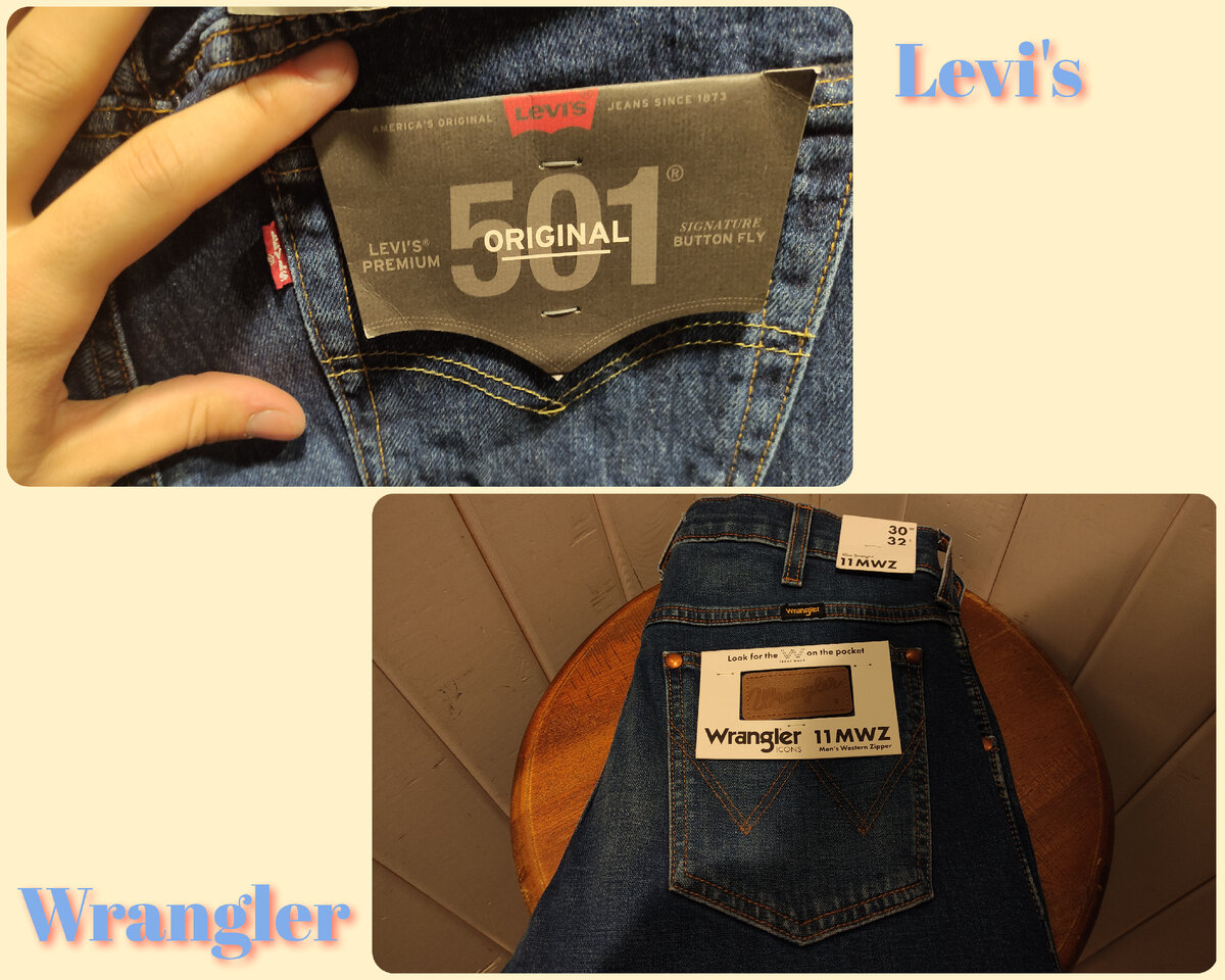 Приветствую всех читателей на канале. В сегодняшней статье мы с вами сравним две довольно интересные модели джинсов - Levi's 501 и Wrangler 11MWZ. После сравнения мы попробуем выявить победителя, так что обязательно дочитайте до конца, чтобы не упустить самое интересное В статье мы постараемся подробно разобрать обе пары джинсов. Для вашего удобства статья разбита на несколько пунктов Первое, с чего я хочу начать - фурнитура На Levi's установлены болты и признаться честно, я не любитель этих самых болтов. По неизвестной мне причине 501 модель выпускается исключительно на болтах, но я бы отдал свое предпочтение именно молнии, если бы была такая возможность. Как по мне - болты это пережиток прошлого, от которого пора отказаться. Но хочется отметить, что все болты сделаны очень качественно, на всех есть гравировка с названием бренда. У Wrangler же установлена молния от крупнейшей Японской фирмы Ykk. Как по мне - этот вариант в разы лучше и удобнее болтов. Но стоит учитывать, что и у Levi'