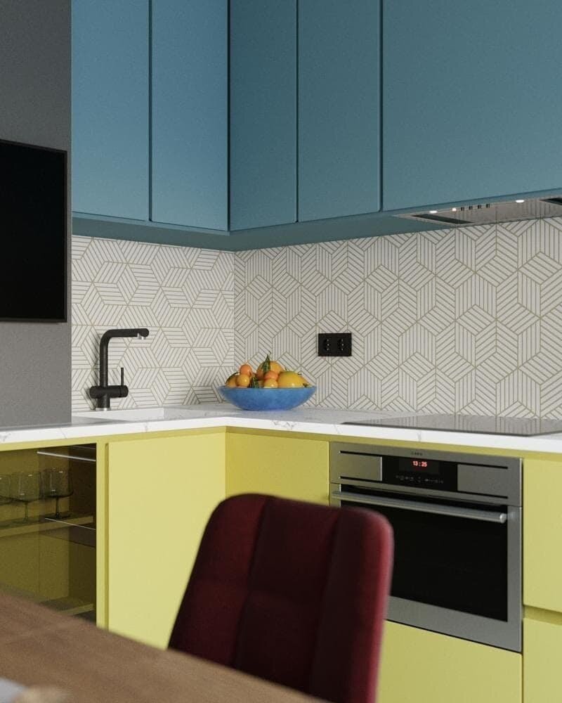 Распорядиться пространством в 8.5 кв.м можно по-разному. Дизайнер Оксана Белозерова разработала для клиентов сразу два варианта, похожих по стилю, но в мелочах отличающихся кардинально. Давайте посмотрим на оба и выберем, какой проект удачней! Да будет цвет Первый вариант получился очень ярким: сочетание жёлтого и бирюзового оттенков на фасадах преображает помещение. При этом сама мебель выглядит очень просто, поэтому даже заметный объёмный узор на плитке не перегружает интерьер деталями. Всё сбалансировано. Кухня небольшая, но кажется просторной. Во многом благодаря опущенной части потолка над шкафами (нет зазора), встроенной технике и свободной зоне окна. Ну и светлая краска на стенах сыграла свою роль. Вид сверху показывает, что даже пространства для перемещения вполне достаточно. В карусели — обеденная зона. Листайте и смотрите! Эстетика тёмного Второй вариант куда более сдержанный. Автору он нравится меньше (но это личное мнение, и я не претендую на объективность). Интерьер стал с