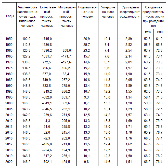 Важнейший параметр, численность населения (вторая графа), увеличивался до начала 1990-х годов. В 1992 году население России достигло своей наибольшей величины 148,6 миллионов человек. Далее наблюдается сокращение численности населения и небольшой подъём после 2010 года.