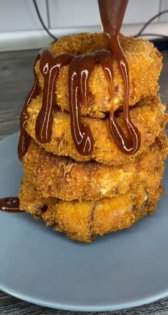Понадобиться: 1. Большая головка лука. 2. Бекон. 3. Большое количество масла. 4. Немного соли. (Примерно половина чайной ложки) 5. Мука. 6. Панировочные сухари. 7. Яйца. (примерно 2 шт) 8.Соус-барбекю. (По желанию) Как готовить: Лук режем кольцами, и аккуратно их разъединяем. После, обатываем бекон вокруг луковых колец. Яйца разбиваем в блюдечко, немного солим и перемешиваем. Луковые колечки окунаем сначала в муку, затем в яйца, и потом в панировочные сухари. В кастрюльку наливаем масло, разогреваем его, и окунаем туда кольца. Жарим примерно 5 минут. (По желанию поверх колец можно налить соус-бербекю) Готово! Приятного аппетита 😘