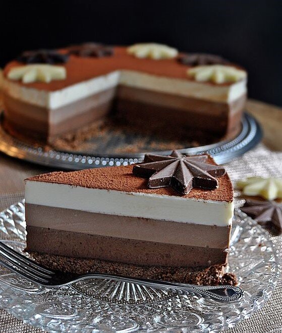 Это очень вкусный десерт из шоколадного бисквита с трехслойным муссовым кремом - торт "Три шоколада". Сочный бисквит на основе тёмного шоколада, пропитанный сливочным ликёром, с невероятно нежным муссом из трёх видов шоколада. Ингредиенты: Для коржа: Для пропитки коржа: Для темного шоколадного мусса: Для молочного шоколадного мусса: Для белого шоколадного мусса: Для шоколадной глазури: Для украшения (по желанию): Этапы приготовления торта: 1. Этап: Готовим шоколадный корж.