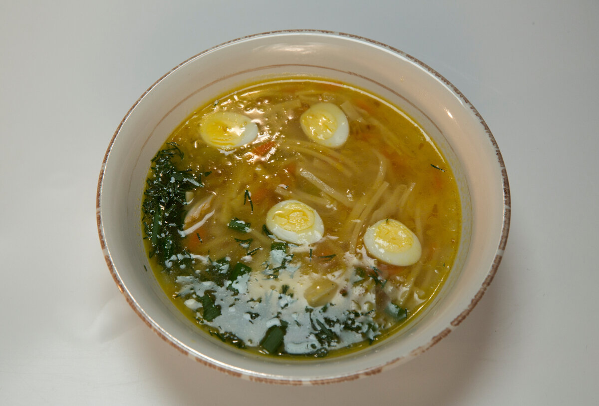 лук зеленый Способ приготовления 1. Ставим кастрюлю с водой на плиту — из расчета 2-2,5 литра на 1300 граммов мяса. Разделываем курицу на куски и помещаем в кипящую воду. Если тушка курицы имеет серо-голубой оттенок, начинайте варку в холодной воде! Варим не больше 30-40 минут после закипания, иначе бульон будет иметь неприятный вкус. 2. Берем половину моркови, половину луковицы и четверть корня сельдерея. Кладем овощи на горячую конфорку прогреваться — это нужно для того, чтобы «озолотить» цвет бульона. Затем отправляем овощи в кастрюлю и солим суп. 3. При закипании снимаем пену и жир. Сбавляем огонь, бульон должен медленно кипеть. Добавляем два-три лавровых листа, горошки душистого и черного перца и не забываем следить за процессом варки и периодически снимать пену. 4. Приготовим лапшу. Высыпаем горку муки на стол, делаем углубление в центре, вбиваем в него одно яйцо, добавляем соль и 8 граммов сливочного масла. Начинаем постепенно замешивать плотное тесто пальцем по принципу «от жид
