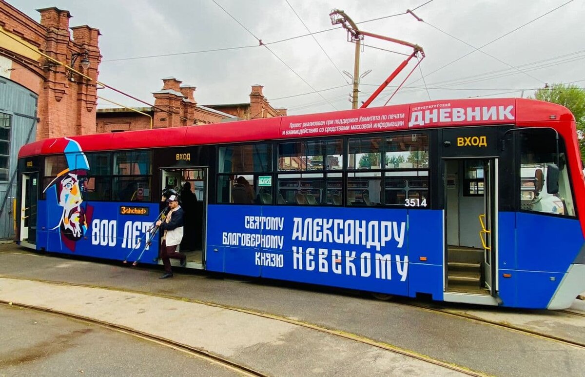 Сегодня, 13 сентября, на дороги Петербурга вышел специальный трамвай с изображением Александра Невского. Это специальный проект издания, Комитета по печати взаимодействию со средствами массовой информации и «Горэлектротранса». Брендированный трамвай отправился по маршруту №3 и будет ходить до 6 декабря – Дня памяти святого благоверного князя Александра Невского по православному календарю. Сегодня во время поездки пассажиры ознакомились со специальным номером «Петербургского дневника», посвященным празднованию 800-летия Александра Невского. «Изображение Александра Невского было специально разработано художниками газеты «Петербургский дневник». Более того, лик святого был согласован с Санкт-Петербургской епархией, от которой мы получили благословение на реализацию этого проекта. Уверена, что такое прочтение портрета Александра Невского привлечет внимание всех петербуржцев и гостей города», – подчеркнула заместитель председателя Комитета по печати и взаимодействию со СМИ Марина Мерцалова.