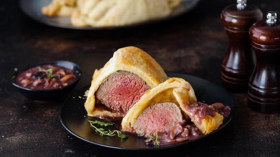 Говядина "Веллингтон" - это праздничное блюдо с говяжьей вырезкой в слоеном тесте. Также внутрь обязательно добавляют ветчину и какие-либо овощи или грибы. Приготовим это блюдо порционно. Вкуснотища! Блюдо очень сытное и довольно необычное! Отличный вариант для праздничного обеда или ужина в небольшой компании, если вы хотите подать горячее порционно. Когда "Веллингтон" готовят целым куском, мясо не достигает и средней прожарки, но англичане и американцы это очень любят и ценят. В случае, если готовить это блюдо порционно, мясо получается более завершенным и готовым! Как приготовить мини-веллингтон с говядиной, буду рассказывать в пошаговом рецепте Продукты для приготовления Мини-веллингтона с говядиной Порций 5 Как приготовить 1. Говядину заранее достать из холодильника, зачистить от пленок. Мясо должно побыть при комнатной температуре 3-4 часа, чтобы при дальнейшем приготовлении серединка не осталась сырой. Хорошо посолить. 2. На смеси растительного и сливочного масел обжарить ч