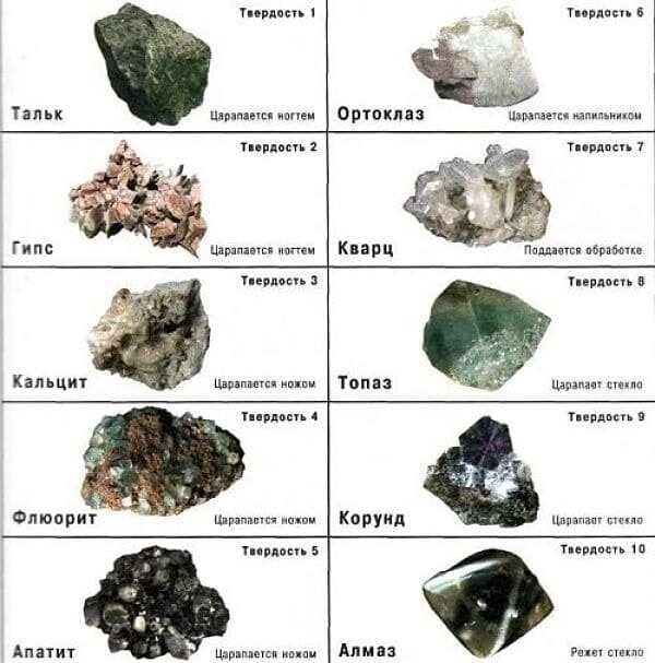 Для определения твердости абразива используют шкалу Мооса. Иногда для этого применяют метод вдавливания, который предполагает вдавливание в поверхность материала пирамиды из алмаза. Механическая стойкость характеризует способность абразива выдерживать нагрузки механического характера, не подвергаясь разрушению в процессе выполнения таких технологических операций, как резка, шлифовка, полировка. Для определения механической твердости используют такое понятие, как предел прочности при сжатии. Для его определения раздавливают зерно абразива, и фиксируют какую нагрузку он способен выдержать при разрушении. С ростом температуры предел прочности абразивов уменьшается. Это обуславливает необходимость жесткого контроля температуры во время выполнения работ. Шкала Мооса В шкале Мооса за эталоны приняты 10 основных минералов, которые указаны в порядке возрастания: Данный вариант определения твердости по специальной шкале был предложен в 1811 году немцем Ф. Моосом. Согласно данной шкале твердость