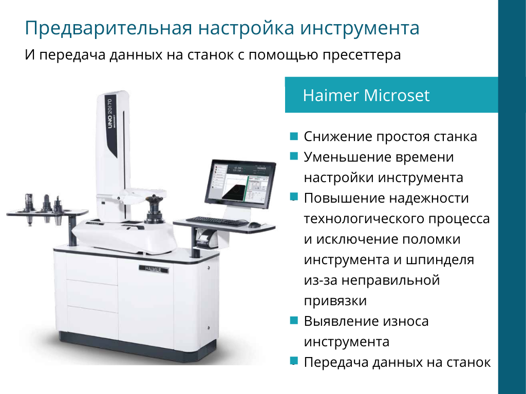 Также важно отметить, что современные приборы предварительной настройки позволяют Другой важный фактор – стабильность механической обработки и улучшение контроля производственного процесса. Когда от смены к смене, от станка к станку – инструмент настроен правильно и проверен на биение и дисбаланс, мы имеем предсказуемое качество деталей. И стабильную стойкость инструмента, который используется в процессе обработки: мы исключаем случаи, когда дорогостоящий инструмент быстро выходит из строя из-за смещения оси при установке в патроне (и при этом приводим к браку) Это практически исключает проблему внеплановых замен инструмента.