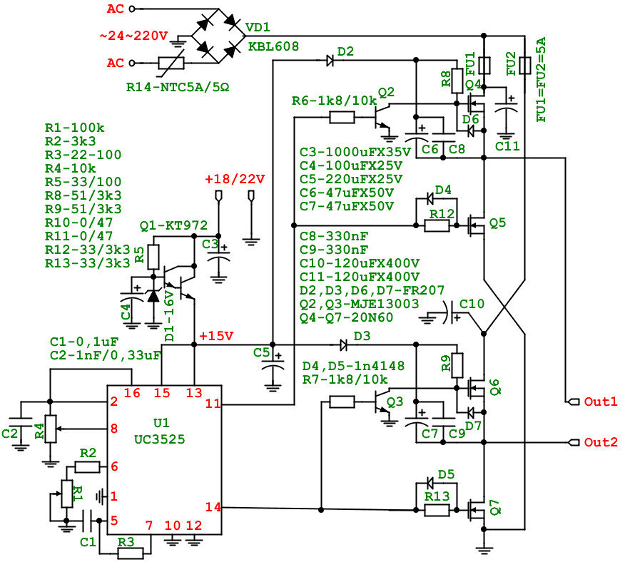 Вариант генератора выше на схеме собран на базе широко распространенного шим-контроллера UC3525 (U1), который управляет мостовой схемой на полевых транзисторах Q4-Q7. Если нижние ключи каждого из полумостов, работающих в противофазе, управляются непосредственно выходами микросхемы 11/14 U2, то в качестве драйверов верхнего плеча применены бустрепные каскады на транзисторах Q2, Q3. Такие каскады широко используются в большинстве современных микросхемных драйверов и достаточно хорошо описаны в литературе, посвященной силовой электронике. Входное напряжение переменное или постоянное (~24~220В/30-320В), подающееся на вход диодного моста (или минуя его в случае подачи постоянного напряжения), питает силовую часть схемы.