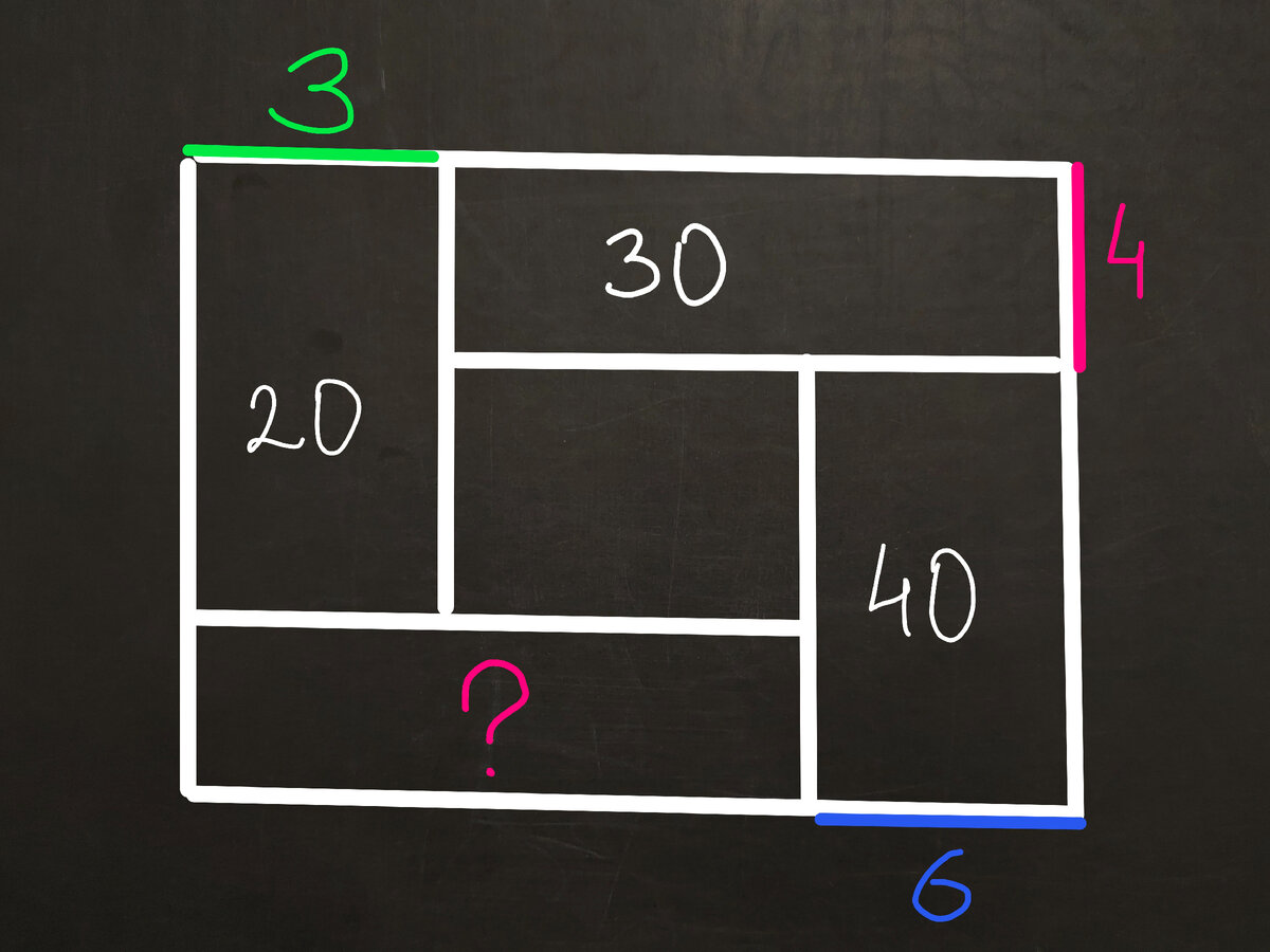P.S. Оказалось, что моё решение слишком сложное и запутанное. Подписчики нашли более простой способ. Площади правого нижнего и левого верхнего прямоугольников отличаются ровно в два раза. И их длины отличаются ровно в два раза, значит, высоты одинаковые. Таким образом, если мы увеличим длину левого верхнего в два раза, он станет равным правому нижнему. Отсюда и верхний правый и увеличенный на 3 нижний левый будут тоже равны и по площади и по сторонам. Увеличение известно - 3*4=12. Вычесть из верхней площади 12 останется 18. (Первым подобное решение прислал читатель с ником "volos-2000").