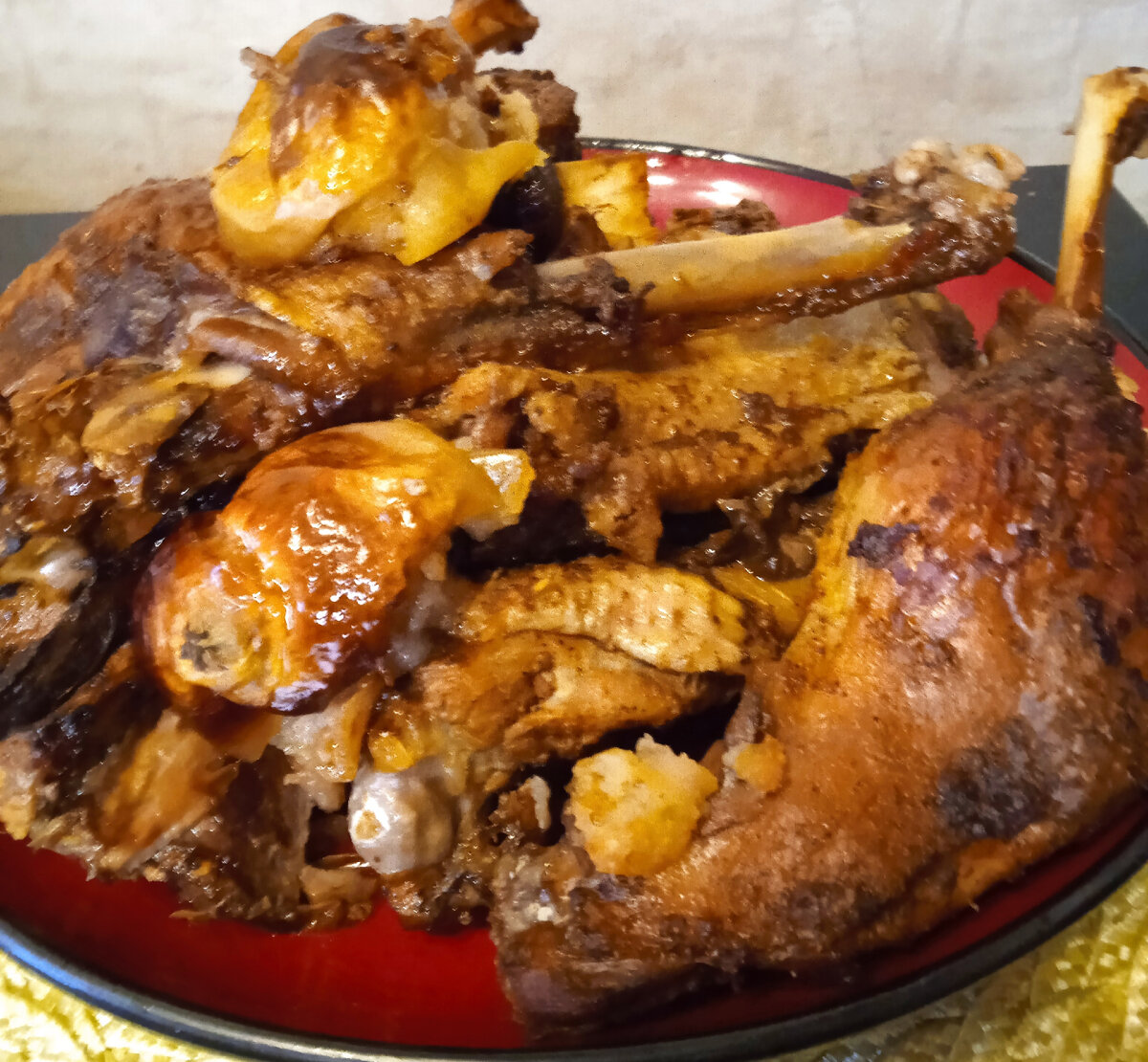 Друзья! Я знаю многие не готовят гуся, считая, что у него жесткое сухое мясо и готовить его надо очень долго. Но зная несколько хитростей можно приготовить очень вкусное деликатесное блюдо. Для начала нужно выбрать хорошо откормленного упитанного гуся. Гусь зажаренный и поданный на стол целиком выглядит очень эффектно, но тогда увеличивается время приготовления, в отличии, если готовить птицу уже разделённую на куски. Да и разделывать готовую горячую тушку на куски тоже не очень удобно.Так что, я предлагаю вам Разделать гуся на порционные куски и замочить его часа на 4-5 в рассоле: Тем временем приготовим маринад: Достать гуся из рассола, обсушить, обмазать маринадом и оставить на 2 часа для маринования. Затем сложить гуся в пакет для запекания. Я когда запекаю птицу, обязательно добавляю яблоки, так я поступила и в этот раз. Можно добавить чернослив, курагу, изюм. Также птица очень хорошо сочетается с цитрусовыми, поэтому можно запекать с лимонами и апельсинами. Запекаем гуся в