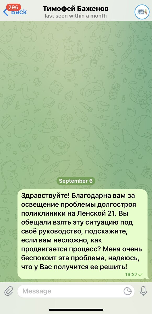 С тех пор никаких новостей о поликлинике не было. Но все же, несмотря на отпуск, Баженов ответил мне в личных сообщениях: снова пообещал держать в курсе.