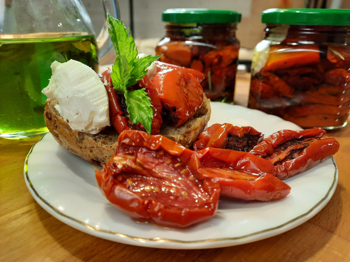 Сегодня готовим вяленые помидоры. Для этого нам понадобится 1.5кг помидоров (сорт Сливка), 1ч.л. базилика, 2ч.л. соли, 3ч.л. сахара, 200г оливкового масла, пара зубчиков чеснока, пара веточек розмарина. Вялить помидоры будем в духовке. Посмотрите видео с рецептом всего 2 минуты или прочитайте схему приготовления. Для начала разрежем помидоры на пополам и уложим на противень застеленный пергаментной бумагой. Посолим, приправим базиликом, обязательно посыплем сахар, помидоры кисловаты. Отправляем помидоры в духовку разогретую до 75 градусов. Вялиться помидоры будут около 8 часов. Дверку духовки оставляем приоткрытой, чтобы выходила влага, иначе помидоры просто сварятся. Противень с помидорами достаем из духовки, они уменьшились в размере в 3-4 раза точно. В подготовленные банки укладываем нарезанный тонкими слайсами чеснок и веточку розмарина. На дно банки наливаем немного масла и начинаем укладывать помидоры. Немного утрамбовываем. И снова подливаем масла. В заключении добавляем чеснок,