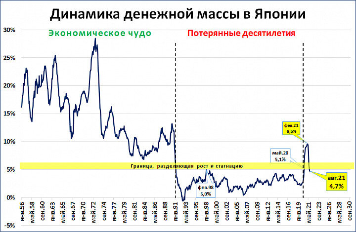Япония отказалась выходить из "потерянных десятилетий" С 1990-х годов экономика Японии растёт низкими темпами, этот период называют "потерянными десятилетиями". Причина такого положения проста: темпы роста денежной массы в Японии в начале 1990-х резко снизились и находились на этом уровне почти 30 лет (см. "Как нам избежать "японской ловушки""). Однако в мае 2020 года произошло неожиданное - темпы роста денежной массы вырвались из застойного диапазона. К февралю 2021 года темпы достигли 9,1% - таких темпов не было с 1990 года. Японская экономика имела все шансы вырваться из "потерянных десятилетий" и показать второе издание "японского экономического чуда" - так называют период быстрых темпов роста японской экономики в 1955-1990 годах. Но чуда не произошло. Начиная с марта 2021 года темпы начали снижаться. А по итогам августа они вновь свалились в ставший привычным за последние 30 лет застойный диапазон. Судя по всему, это была не осознанная попытка Банка Японии решить тридцатилетнюю п