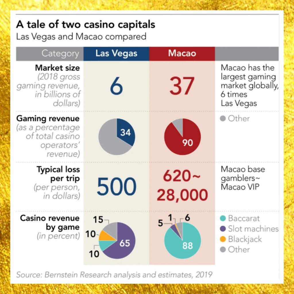 🗜️Ну и наконец, в Макао работает всего 6 лицензированных операторов казино, а в Лас-Вегасе их 20, что приводит к большой конкуренции и демпингу.
