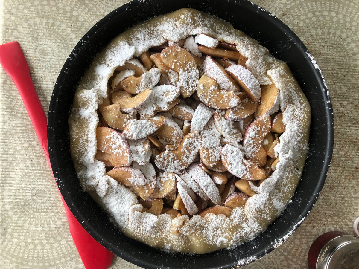 Без долгих предисловий перейдём к рецепту. Скажу только, что вкуснее всего есть этот пирог почти сразу, минут через 10-15 после того, как испечётся. Тесто без сахара: на круглую форму диаметром 26 см 80 г сливочное масло, 72,5% подойдёт 80 г вода 200 г пшеничная мука в/с щепотка соли В небольшой кастрюле довести до кипения воду со сливочным маслом и солью, снять с огня, всыпать муку и тщательно перемешать силиконовой лопаткой. Когда тесто станет более менее однородным, лопаткой же сформировать шар, загибая края теста к центру. Завернуть в пакет или пищевую плёнку, оставить на столе. Включаем духовку на прогрев до 180С. В это время готовим начинку и лепим пирог. Яблоки, специи и сахарная пудра: Яблоки кисло-сладкие нарезать на ломтики средней толщины (примерно 0,5 см со стороны кожицы), у меня уходит такая ёмкость объёмом 1,8 л. Теперь распределяем тесто, оно ещё очень тёплое, по форме от центра к бортикам, прижимая его ладонью и пальцами ко дну форму и затем к бортикам. Форма для вы