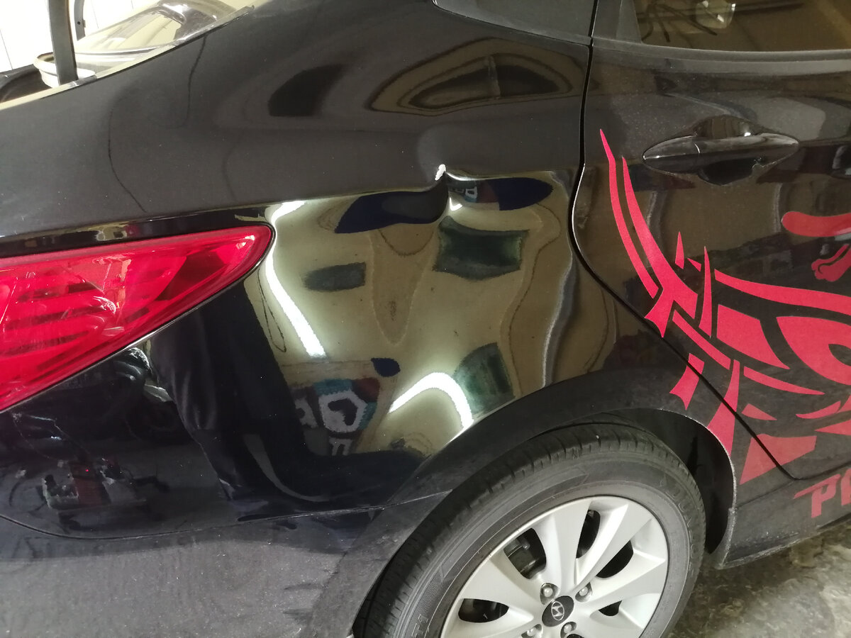 Красивая машина нас сегодня посетила. На кузове нанесена яркая раскраска с надписью "Пантера". Прямо так и хочется написать: -"История Розовой Пантеры... " :-) "Хищнице" не повезло. Со слов владельца, ей в крыло прилетел самокатчик... Влетел сильно. #Вмятина на крыле серьёзная. Площадь большая, ребро жёсткости сломано.... Даже краска откололась. Задача стоит так: - Надо максимально #выправить крыло. -Надо сохранить при этом всю остальную краску. -Где краска откололась, подкрасить. -Царапины отполировать. -Выполнить ремонт за сегодня. Приступаем к ремонту! Для доступа к повреждению с внутренней стороны снимаем обшивку багажника. Под обшивкой нас ждал "неприятный сюрприз" в виде перегородки, которая ограничила доступ к повреждению и осложнила работу. Пришлось снять ещё и фонарь... Когда доступ обеспечен пошла работа! Для того что бы остальная краска при ремонте не потрескалась, место ремонта надо нагреть. Но рук - то всего две!!! Применяем хитрость! Крепим нагреватель на присо