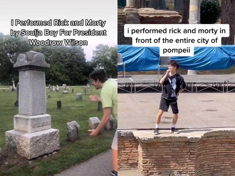 Ссылаясь на невероятно популярный одноименный мультсериал для взрослых "Рик и Морти", который широко распространяется на TikTok с момента его выхода в середине июня. Но в дополнение к видеороликам, посвященным самой песне (на TikTok их более 342 000), она также превратилась в мем, в котором TikTokers освещают песню перед надгробиями (некоторые принадлежат известным фигурам, а другие намеренно приписываются им), друзьями и растениями. Тенденция началась с видео перед могилой, ошибочно приписываемой президенту Вудро Вильсону