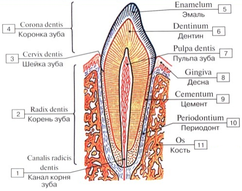 Зуб состоит из нескольких слоев: Строение: дентинные трубочки (содержащие отростки одонтобластов), коллагеновые фибриллы (собраны в пучки, имеют два направления: радиальное и тангенциальное) и основное вещество. Слои дентина: Предентин- зона молодого необызвествленного дентина, расположенного на границе с пульпой, способен на протяжении всей жизни к росту. Околопульпарный- средний слой минерализованного дентина содержащий тангенциальные волокна Эбнера. Плащевой- поверхностный слой дентина, полностью минерализованный, содержащий радиальные волокна Корфа. Есть бесклеточный и клеточный цемент: Бесклеточный (первичный)- прилежит к дентину и покрывает корень. Строение - коллагеновые волокна (продольное и радиальное расположение); аморфное вещество; линии роста расположены близко друг к другу. Клеточный (вторичный)- - покрывает бесклеточный цемент, апикальную треть корня и область бифуркации многокорневых зубов. Строение-цементоциты в лакунах, отростки анастомозируют друг с другом; ко