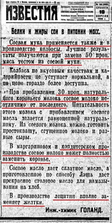 «...Соевая мука применяется также и в производстве колбасы. Лучшие результаты получаются при замене 50 % мяса тестом из соевой муки ...