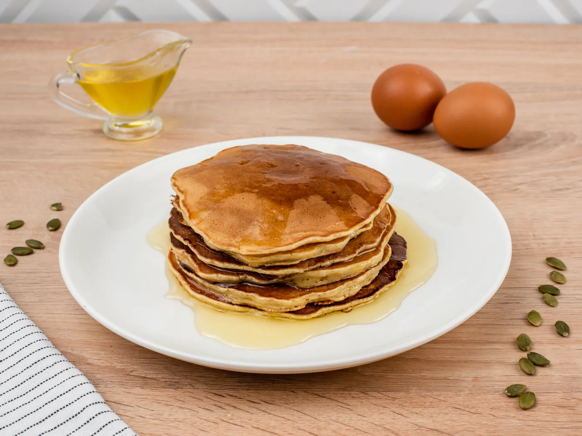 Тыква — это питательный и вкусный сезонный овощ, с которым можно приготовить много различных блюд. Но лучше всего она раскрывается в десертах и сладкой выпечке. Например, в панкейках. Эти американские пышные блинчики приобретают очень интересный вкус и яркий теплый цвет, если в них добавить тыквенное пюре. Тыквенные панкейки получаются очень вкусными, нежными и питательными. Такое блюдо идеально подойдет для завтрака. ПРОДУКТЫ ДЛЯ БЛЮДА ДЛЯ УКРАШЕНИЯ ПОШАГОВЫЙ ФОТОРЕЦЕПТ ПОДГОТОВИТЬСЯ Тыкву очистите и нарежьте на произвольные кусочки. Подготовьте остальные ингредиенты. НАЧАТЬ ГОТОВИТЬ Тыкву натрите на мелкой терке или измельчите с помощью погружного блендера. В глубокую чашу разбейте яйца. Добавьте муку, сахар, соль и разрыхлитель. Влейте молоко и перемешайте все до однородности. Добавьте пюре из тыквы и всё аккуратно перемешайте. Разогрейте сковороду с растительным маслом. Жарьте панкейки 2 минуты с одной стороны, пока края панкейков не зазолотятся. Переверните панкейк и жарьте еще 1