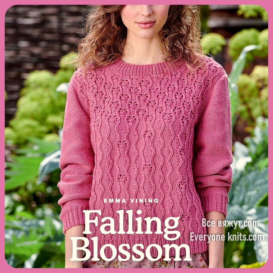 Идею прелестного узора "Опадающие листья" Эмме Вайнинг подсказала сама природа. Отдельные цветочные мотивы будто бы слетают сверху вниз. В основе изделия использована изнаночная гладь, затем постепенно вводится цветочный узор, который постепенно поднимаясь, заполняет всю верхнюю часть пуловера. Длинные волнистые линии из скрещенных петель формируют очертания цветков. Узор расположен на спинке и переде, а рукава выполнены только изнаночной гладью. Планки нижнего края спинки, переда, рукавов и горловины выполнены резинкой.