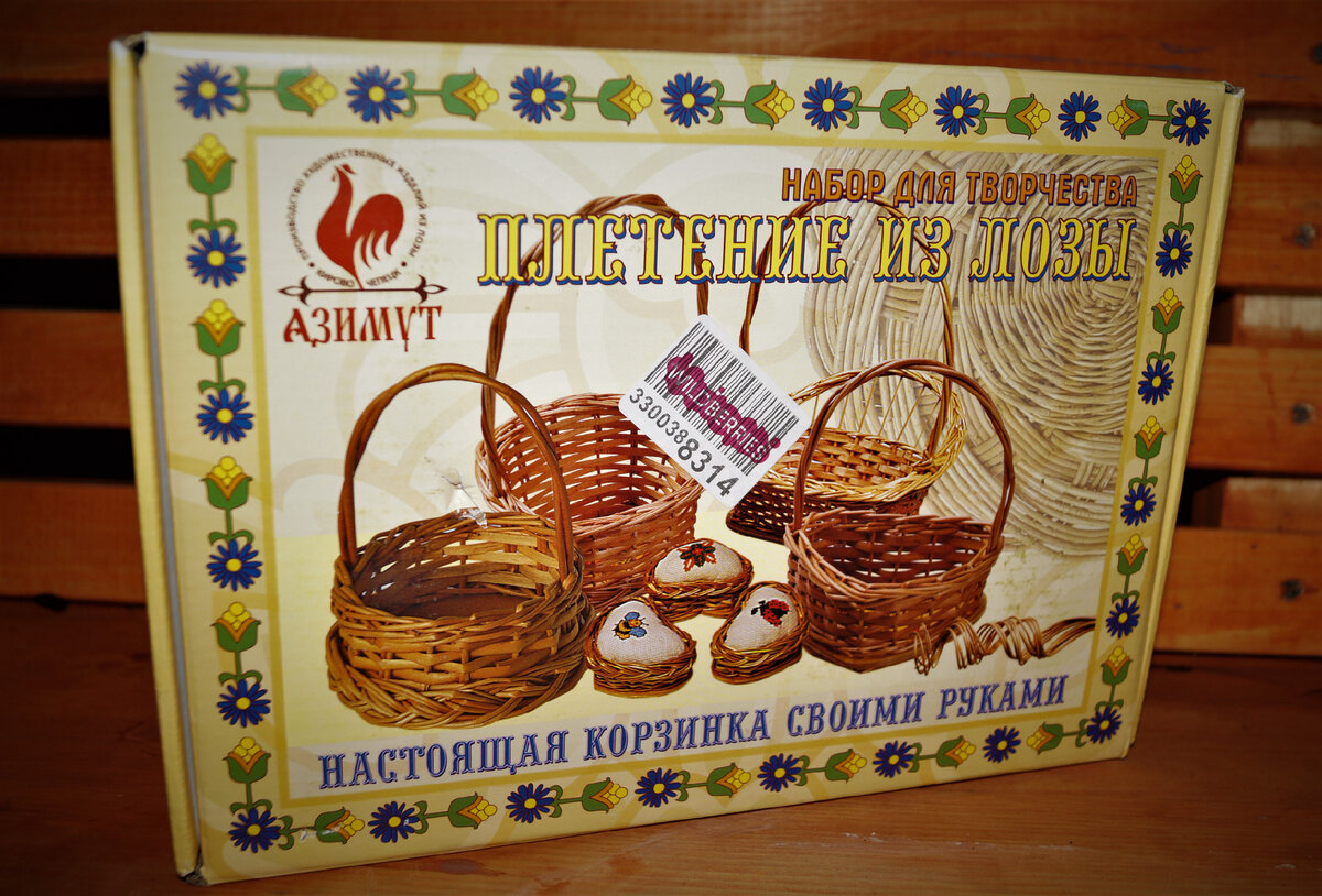 Здравствуйте, дорогие читатели! Природа севера располагает к творчеству. Когда тебя окружает красота лиственного и хвойного леса, устланного мховыми коврами, возникает непреодолимое желание взять частичку этой красоты с собой и сделать что то для дома. Это может быть просто букет из хвойных растений в сочетании с полевыми цветами, а может быть что то посложней - например, корзина, изготовленная из ивовых прутьев. На поиски информации по правильной заготовке материала и сам процесс уйдет немало времени. Поэтому я решила сделать первые шаги в плетении корзин с уже готовыми заготовками. Почему именно корзина? Мне просто интересна эта тема, я давно хотела научиться плести корзинки самостоятельно. Что в наборе: прутья - короткие и 4 длинных, лента, основа с отверстиями, контейнер для замачивания, буклет-инструкция. Самое интересное то, что инструкция дана по плетению на круглой основе, а у меня в наборе основа квадратная. Замачивать материал нужно обязательно. В инструкции не указано на ка