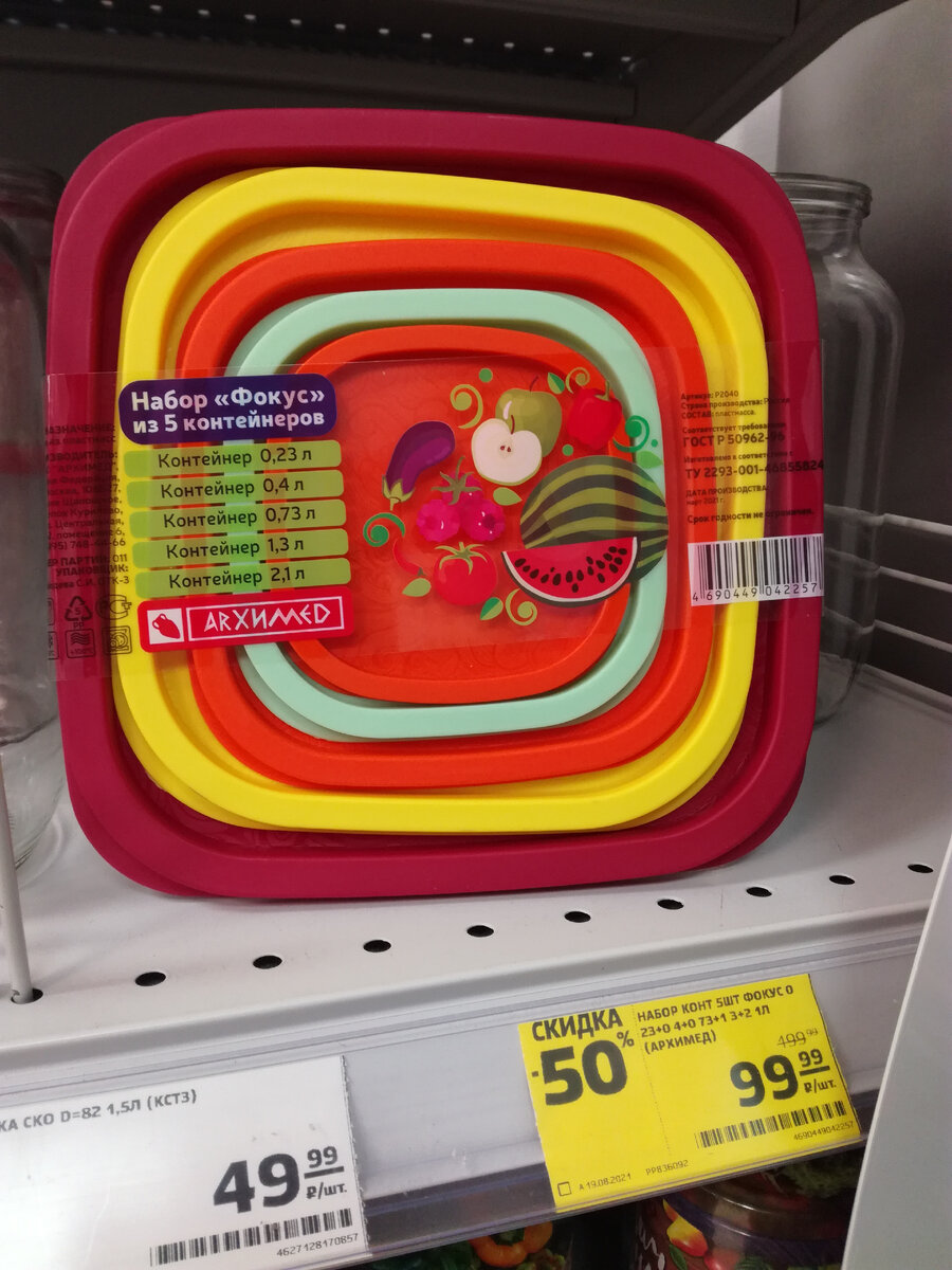Годный товар, это полезный товар, по нашему мнению. То есть товар, который так или иначе пригодится и ты не пожалеешь, что его купил. Пускай он стоит дорого, дёшево, всё равно. Главное, он нужный и вечный! Контейнеры для продуктов питания в Магните Они делятся на два вида: Пластмассовые дешевле, удобней, но гнутся и могут повредиться. А ещё могут изменить форму продуктов внутри контейнера, например, помять, смять и т.п. Поэтому, лично, советуем покупать более дорогие контейнеры - стеклянные, или использовать банки=) Итак, в Магните есть несколько контейнеров. Первый вариант: 5 штук разных размеров (0,23; 0,4; 0,73; 1,3 и 2,1 л). Всего за 99 р. Второй вариант: 3 контейнера по 1,55 л. Цвет оранжевый и голубой. 139 р. Оба варианты производства из России, вот вам и импортозамещение китайских аналогов) Правда, один из Владивосток