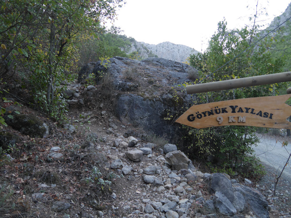 При входе в каньон с нас попросили плату в несколько лир с человека. Отдав входную дань, выходим к указателю начала тропы. Тропинка резко уходит наверх.