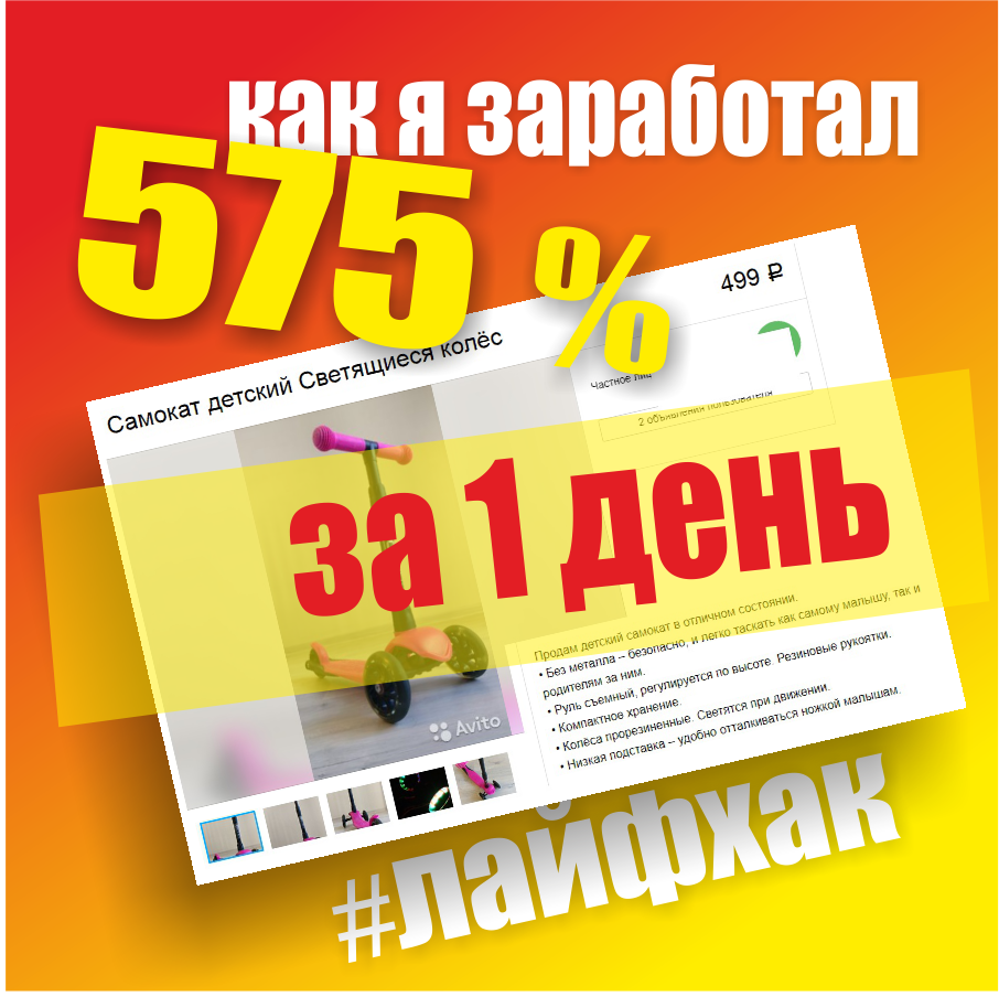 Вариантов заработать у детей немного. Дни рождения, Новый год, праздники, бабушки и дедушки. Делюсь с вами своим новым опытом. Как я заработал 575% за 1 день. Даже за 69 минут. В нашем жилом комплексе есть телеграм-чаты «Барахолки». В них жители размещают объявления о продаже своих ненужных вещей. Но часто даже не продают, а отдают бесплатно или «за шоколадку». Такие же объявления можно найти на «Авито» или «Юле». Приём очень простой – взять хороший товар практически бесплатно и перепродать его. То есть берём у тех, кому не нужно и отдаём тем, кому нужно. За это получаем деньги. Именно так я сделал в воскресенье. Папа показал мне объявление о том, что люди отдают детский самокат в отличном состоянии за «Киндер-Сюрприз». Мы договорились о встрече. Тут же зашли в «Пятёрочку» и я купил «Киндер» за 74 рубля. Сразу из магазина мы зашли за самокатом. Как в рекламе: «15 минут и самокат уже тут». Потом папа помог мне сделать фотографии, написать интересное объявление, подобрать привлекательную