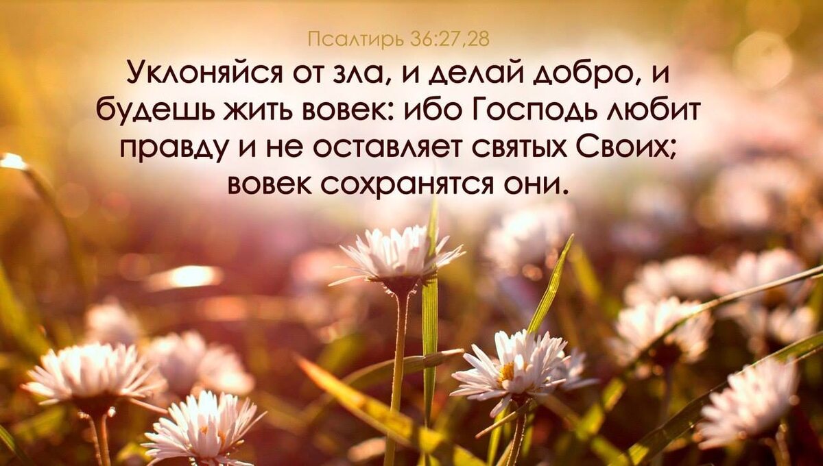 «Уклоняйся от зла, и делай добро, и будешь жить вовек; ибо Господь любит правду, и не оставляет святых Своих; вовек сохранятся они; и потомство нечестивых истребится. Праведники наследуют землю, и будут жить на ней вовек. Уста праведника изрекают премудрость, и язык его произносит правду. Закон Бога его в сердце у него; не поколеблются стопы его. Нечестивый подсматривает за праведником и ищет умертвить его. Но Господь не отдаст его в руки его, и не допустит обвинить его, когда он будет судим. Уповай на Господа, и держись пути Его: и Он вознесет тебя, чтобы ты наследовал землю; и когда будут истребляемы нечестивые, ты увидишь» (ст. 27-34).
