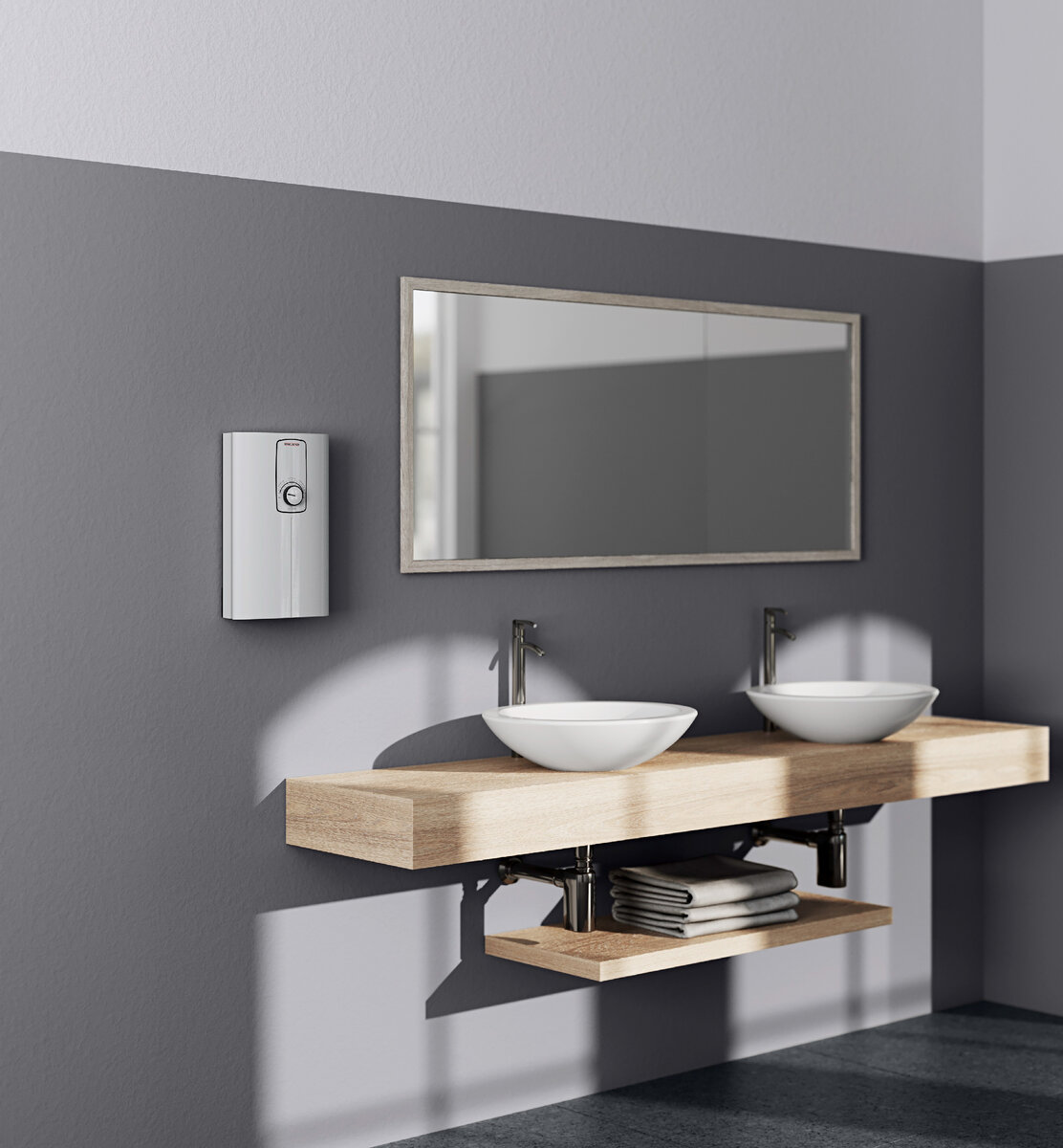 Широкий модельный ряд проточных водонагревателей STIEBEL ELTRON предусматривает любую ситуацию. Например, маленькую, но весьма мощную модель серии DCE-S PLUS можно установить в любом месте, потому что его сверхкомпактный размер и легкий вес, позволяет это сделать. Существует два главных вида монтажа: скрытый и открытый Скрытый метод монтажа означает, что все трубы, провода и водоразводка будет спрятана в стене, а глаз будет радовать красивый корпус водонагревателя. Этот метод особенно актуален, если вы еще в процессе ремонта и вам несложно организовать подобную установку. Открытый монтаж говорит сам за себя. Такой вариант подойдет, если водонагреватель находится не на виду, а стоит, например, в помещении технического назначения. Если в ванной нет другой возможности установки, то можно спрятать его в сантехнический шкаф. Подключение к системе водоснабжения Для врезки проточного водонагревателя в систему подачи холодной воды, используются два специальных тройника для холодной и горячей