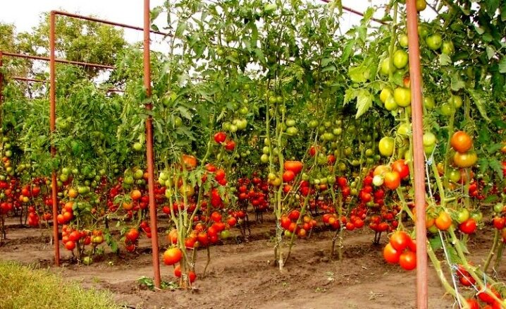 «Лес» из кольев на моих томатных грядках исчез навсегда. Вместо него я установил шпалеру. Теперь и на огород любо-дорого глянуть , и томаты растут крепкими и здоровыми. Перед посадкой делаю лунки 40х40 см через 50-60 см друг от друга. Заполняю их смесью перепревшего навоза, минеральных удобрений и питательного грунта. Высаживаю в каждую по 1-2 растения, после чего обильно увлажняю. Такие поливы необходимы и перед каждой подкормкой (кстати, первую провожу через 7-10 дней после посадки), чтобы питательный раствор лучше проникал в грунт и усваивался растениями. Не забываю и о профилактике болезней: от фитофторы 6-7 раз за сезон опрыскиваю томаты настоем чеснока (30-40 г на 10 л воды). Обычно пасынки удаляют, а я все-таки несколько оставляю. Обрезаю их, когда достигнут 15-20 см, и ставлю в воду. Через 10-12 дней, когда они образуют корни, высаживаю в грунт. Это отличны способ для размножения томатов редких сортов! «Красоту навожу«, подвязывая растения к шпалере. На её создание уходит не та