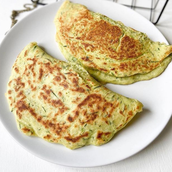 🔹Сковороду смазать маслом, разогреть и выливаем половину теста и поджариваем блин, переворачиваем, кладём половину тёртого сыра и измельчённую курицу 50 гр. складываем блин как на фото и ещё поджариваем его до готовности под крышкой.
